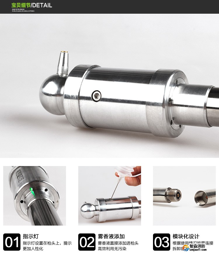 該產品由于采用特制的霧香液電子霧化技術,發出的煙霧有各種香味且綠色環保,無毒無害。根據火災探測器倒掛在頂棚上的狀況,為避免加煙后煙霧長時間滯留在火災探測器迷宮內,特制霧香液霧化成煙后的比重大于空氣比重,加煙試驗后短時間內能在迷宮內快速消失,有利于提高試驗工作效率。電子霧化發煙代替原有的傳統的棒香加煙方式,不僅加煙方式有了進一步的升華而且煙霧中不含煙塵煙油,可避免棒香加煙所產生的煙塵煙油對火災探測器造成二次污染。同時由于該產品采用了內部霧香液循環技術,降低霧香液的自然損耗,延長了霧香液使用時間,耗材使用成本隨之減少。